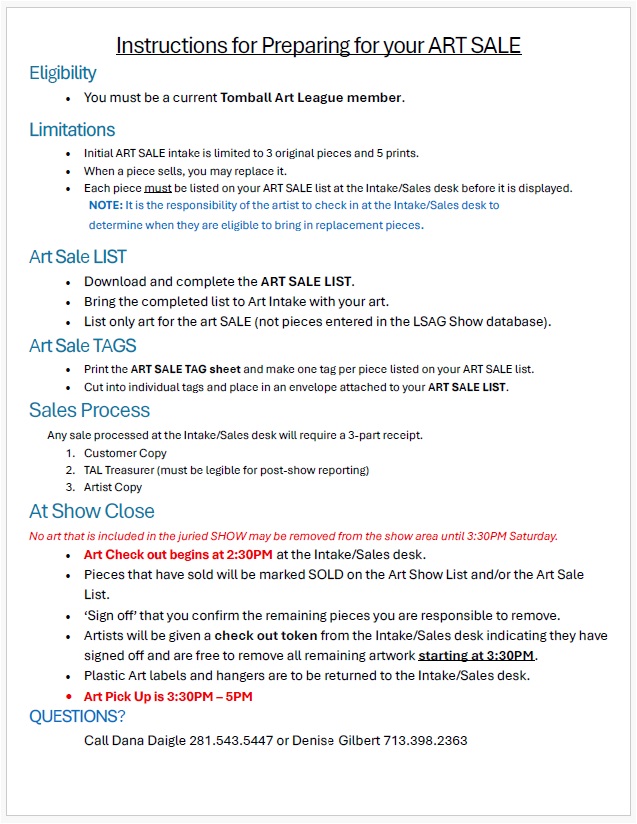 HOW TO SELL ARTWORK IN TOMBALL ART LEAGUE SHOW & SALE ________________________________________________________________________________________